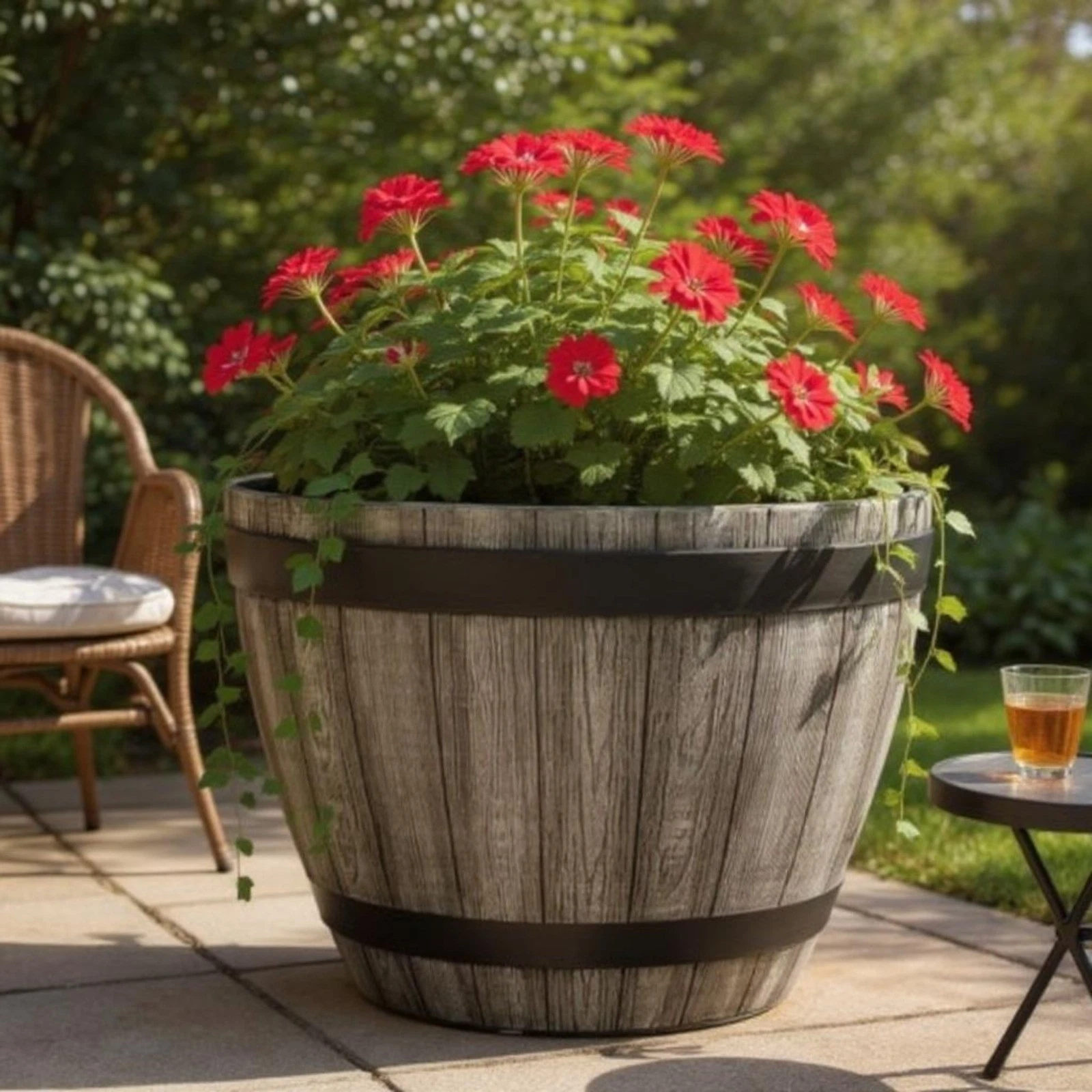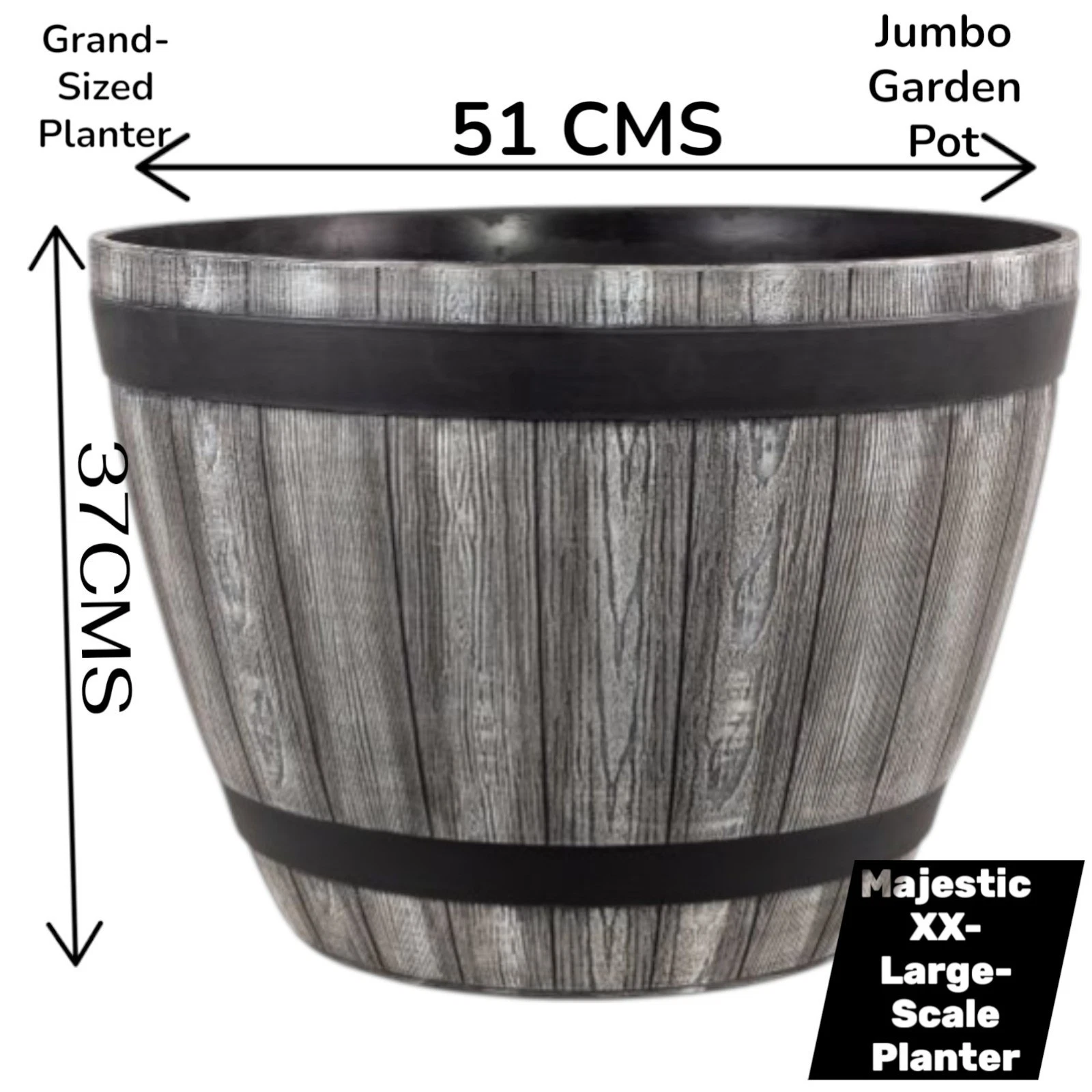 • 1 × XXL rustic wood effect barrel planter.